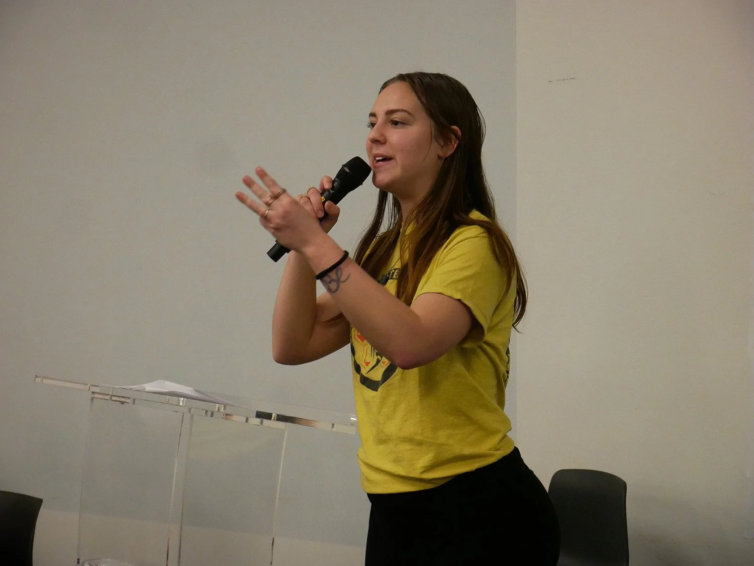 Sarah Barnts, Tenant Union Network Organizer at STUN, was the master of ceremonies for the town hall. Photo courtesy Zachary Atticus Stockton.